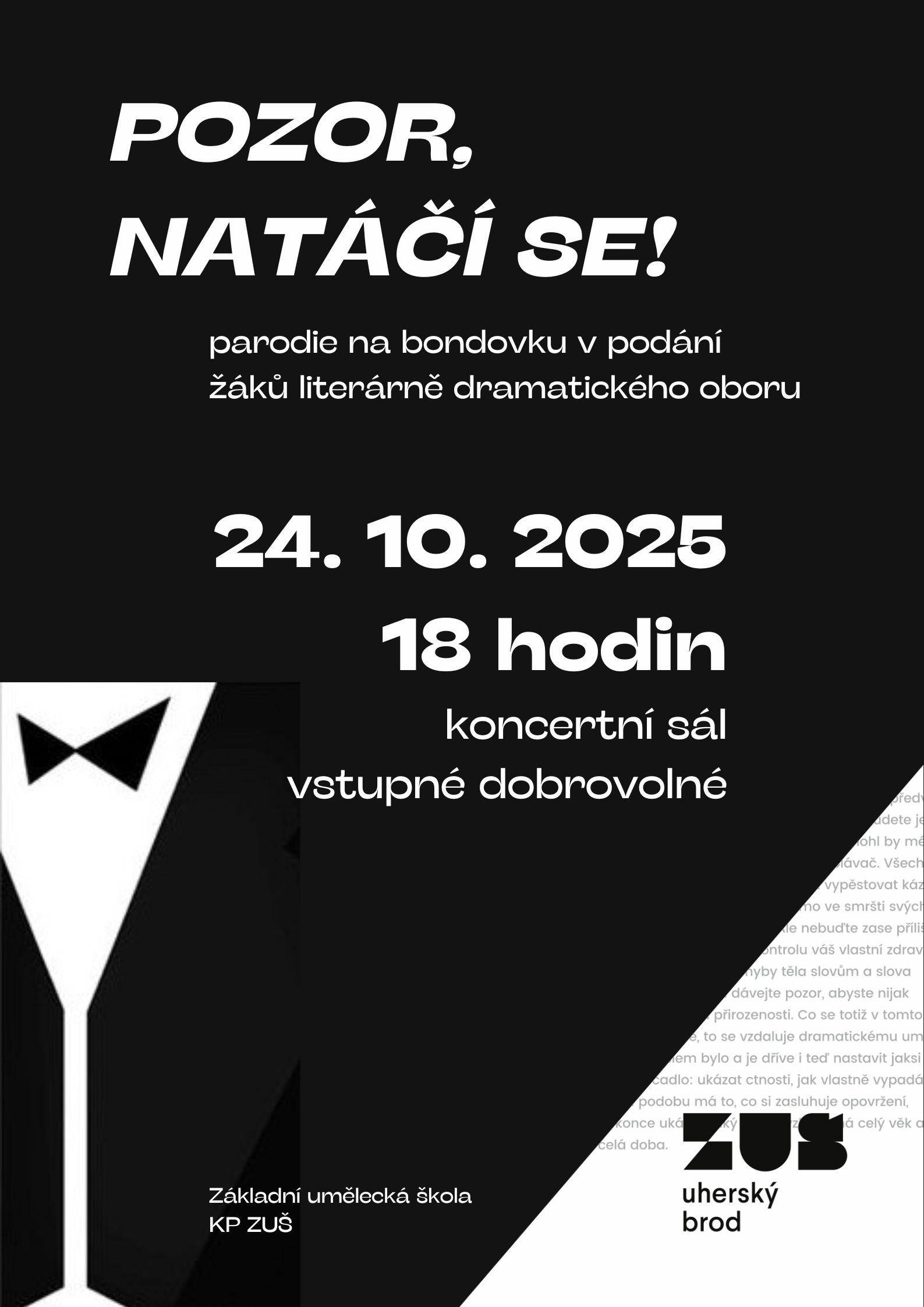 Přijďte strávit divadelní podvečer ve společnosti našich dramaťáků! Nebudete litovat!  Parodie na bondovku vás zaručeně pobaví! Nebude chybět ani krásná blondýna a ikonické Martini.